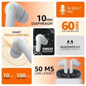amazon basics TWS in-Ear Earbuds (S19) with Fast Charging up to 50 Hours of Playtime | Dual 10mm Driver | IPX4 Water-Resistance | Bluetooth 5.3 | Touch Control (White)