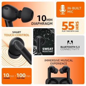amazon basics True Wireless in-Ear Earbuds with Mic, Touch Control, IPX5 Water-Resistance, Bluetooth 5.3, Up to 55 Hours Play Time, Voice Assistance and Fast Charging (Black)