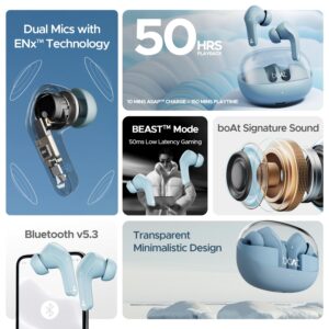 boAt Airdopes 311 Pro, 50HRS Battery, Fast Charge, Dual Mics ENx Tech, Transparent LID, Low Latency, IPX4, IWP Tech, v5.3 Bluetooth Earbuds, TWS in Ear Earbuds Wireless Earphones with mic (Dusk Blue)