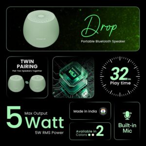 HAMMER Drop 5W Bluetooth Wireless Speaker with Twin Pairing, 1200 mAh Battery, 100H Standby Time, TWS Function, TF Card, USB Slot, Auto-Pairing, in-Built Mic, Type-C Charging, 52mm Driver (Green)