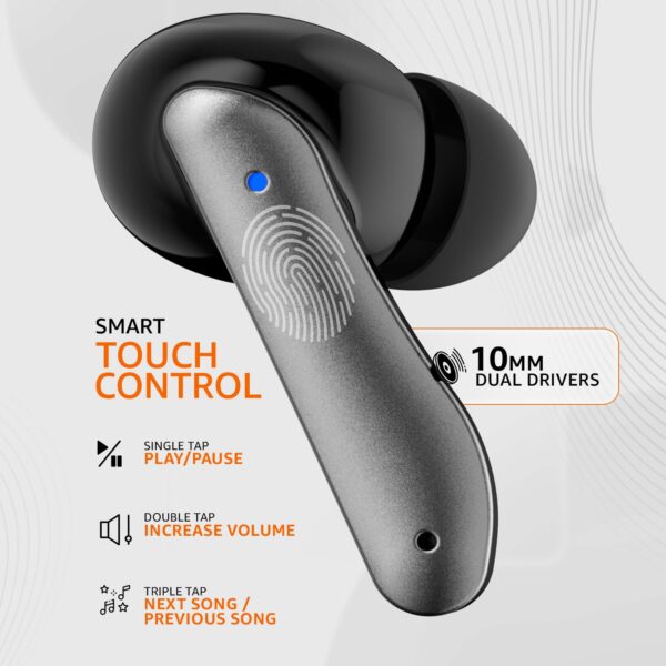 Controls – Smart Touch Control lets you play/pause music, answer calls with a tap, skip tracks with a double tap, and adjust volume by holding your finger in place.