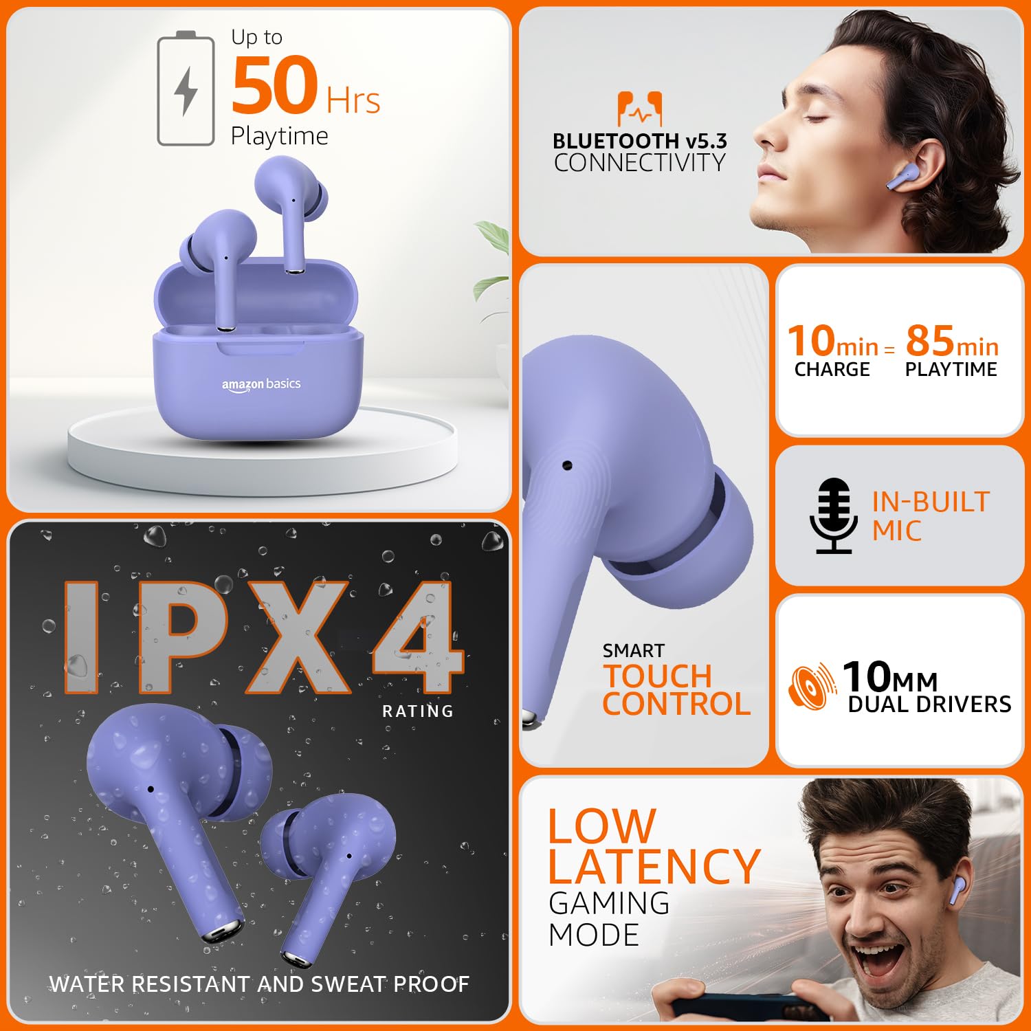 amazon basics TWS in-Ear Earbuds (S19) with Fast Charging up to 50 Hours of Playtime | Dual 10mm Driver | IPX4 Water-Resistance | Bluetooth 5.3 | Touch Control (Purple)