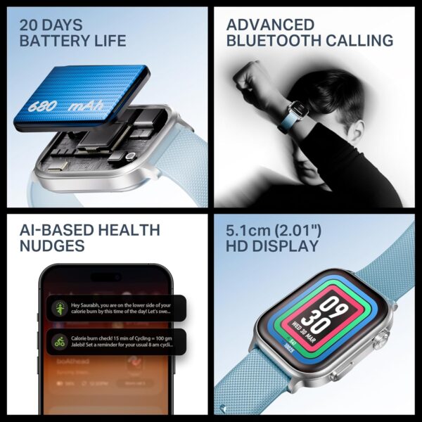Presenting the world’s first smartwatch to feature a mega 680mAh battery that delivers a game-changing 20 days of heavy usage life—Storm Infinity Max shatters battery life benchmarks. Storm Infinity Max redefines power with up to 20 days of heavy use and charges to 100% in just 60 minutes. Forget daily charging anxiety—this watch is built to keep up with your life, not slow it down. AI-Based Health Nudges learn from your daily patterns and deliver meaningful suggestions—like when to rest, hydrate, or push your goals. The more you wear it, the smarter it gets, adapting to your lifestyle in real time. Experience everything on the largest-ever 2.01” HD display in a smartwatch. With sharp resolution and a raise-to-wake gesture, your updates, calls, and workouts stay visible—even under harsh sunlight. Take a smarter approach to wellness with the Wellness Balance Score—your personal health dashboard, built from activity, sleep, heart rate, and SpO₂ data. It activates after 2 weeks of consistent activity and reflects your overall physical and emotional balance. Make daily routines effortless with the QR Tray. From UPI codes to metro passes and business cards, your essentials are always one tap away—right on your wrist.Stay on top of your body and performance with 24×7 heart rate, SpO2, stress, sleep tracking, and guided breathing. And when it’s time to move, access multiple sports modes instantly with the dedicated lower side button—engineered for fitness fanatics. Enjoy Bluetooth calling with a built-in speaker, mic, dialpad, and synced contacts. Make or take calls seamlessly, even while multitasking. Catch live updates with real-time sports scores for cricket and football, so you never miss a moment of the match. Trigger help with Emergency SOS using the lower side button—because safety should always be one tap away. And with the functional crown, navigate like a pro—scroll, select, and switch screens with ease, even when your hands are busy.