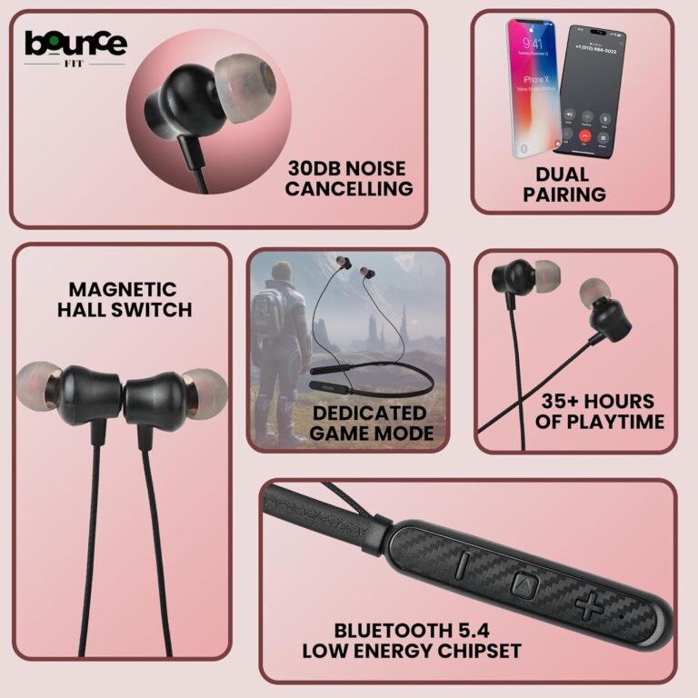 Be the first to review “Bouncefit Sonic 144 Bluetooth Wireless Neckband, 35 Hours Continuous Playback Battery, Fast Charge, IPX7, Low Latency, Active Noise Cancellation, Magnetic Earbuds with Mic Earphones (Black)”
