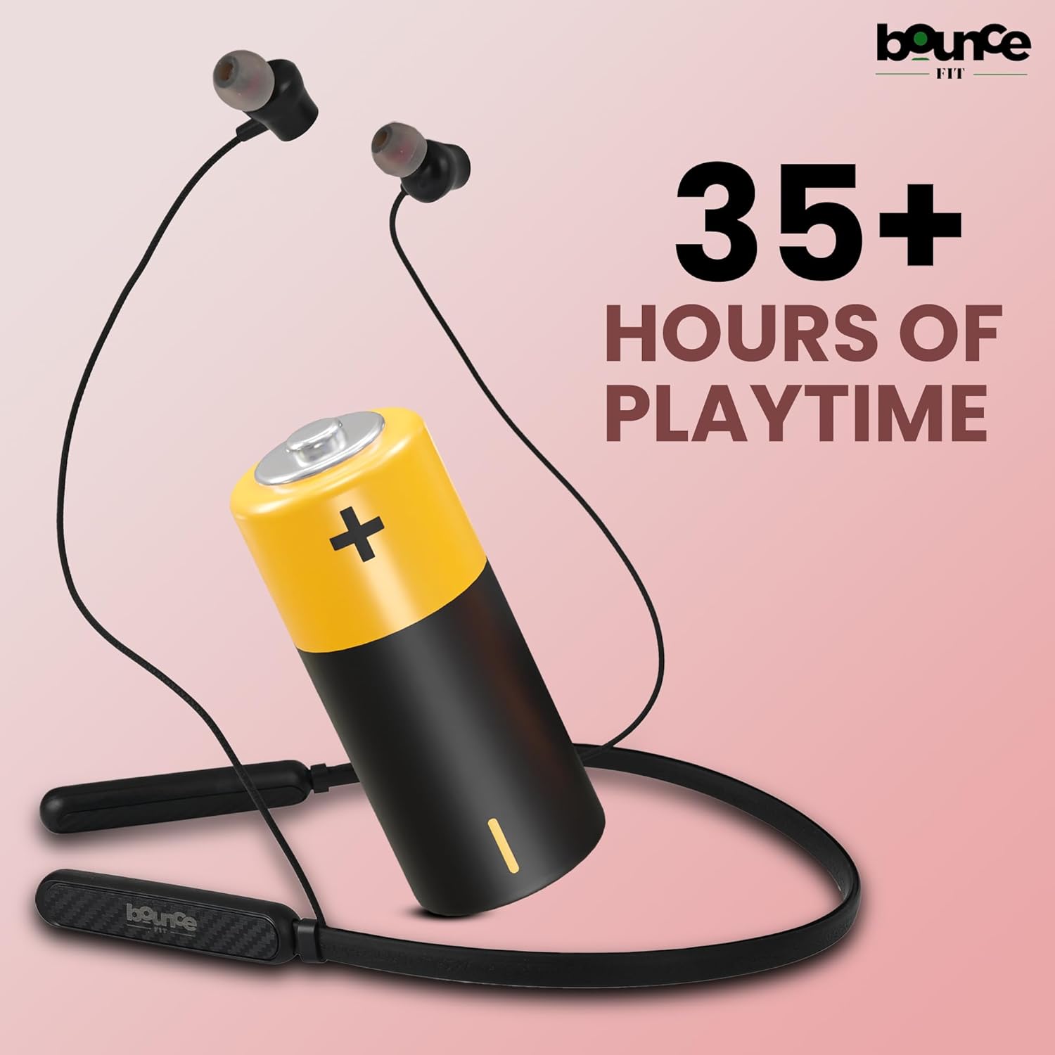 Bouncefit Sonic 144 Bluetooth Wireless Neckband, 35 Hours Continuous Playback Battery, Fast Charge, IPX7, Low Latency, Active Noise Cancellation, Magnetic Earbuds with Mic Earphones (Black)