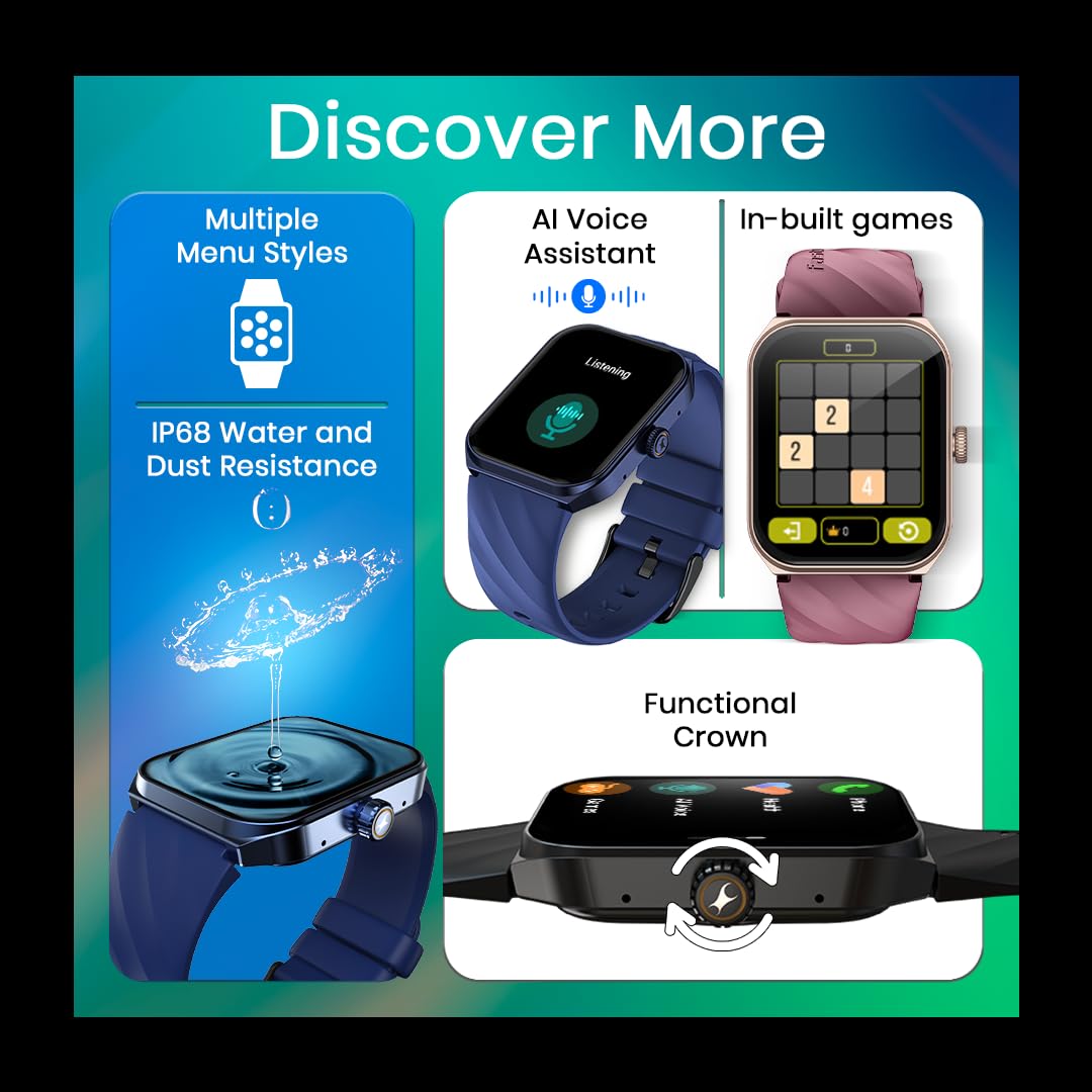 NitroFast Charging, AI Voice Asistance, Advanced 100+ Cloud Watchfaces, Multisport, Up to 5 day battery, IP68 Water Resistance and many more handy features at a single tap; Health Monitoring with Stress monitor, 24×7 HRM, SPO2 ,Women’s Health