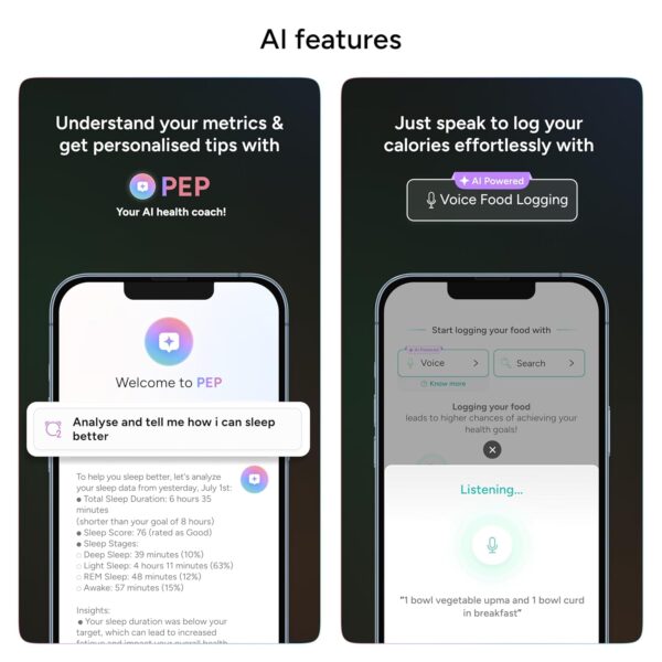 AI POWERED: PEP, VOICE BASED FOOD LOGGING: PEP is your AI-powered health coach that decodes your fitness, sleep, and stress metrics. It tracks changes and gives personalised, actionable tips to keep you on track. Also, with Voice-based food logging you just speak into your phone to log meals – making nutrition tracking quick, easy, and hassle-free.