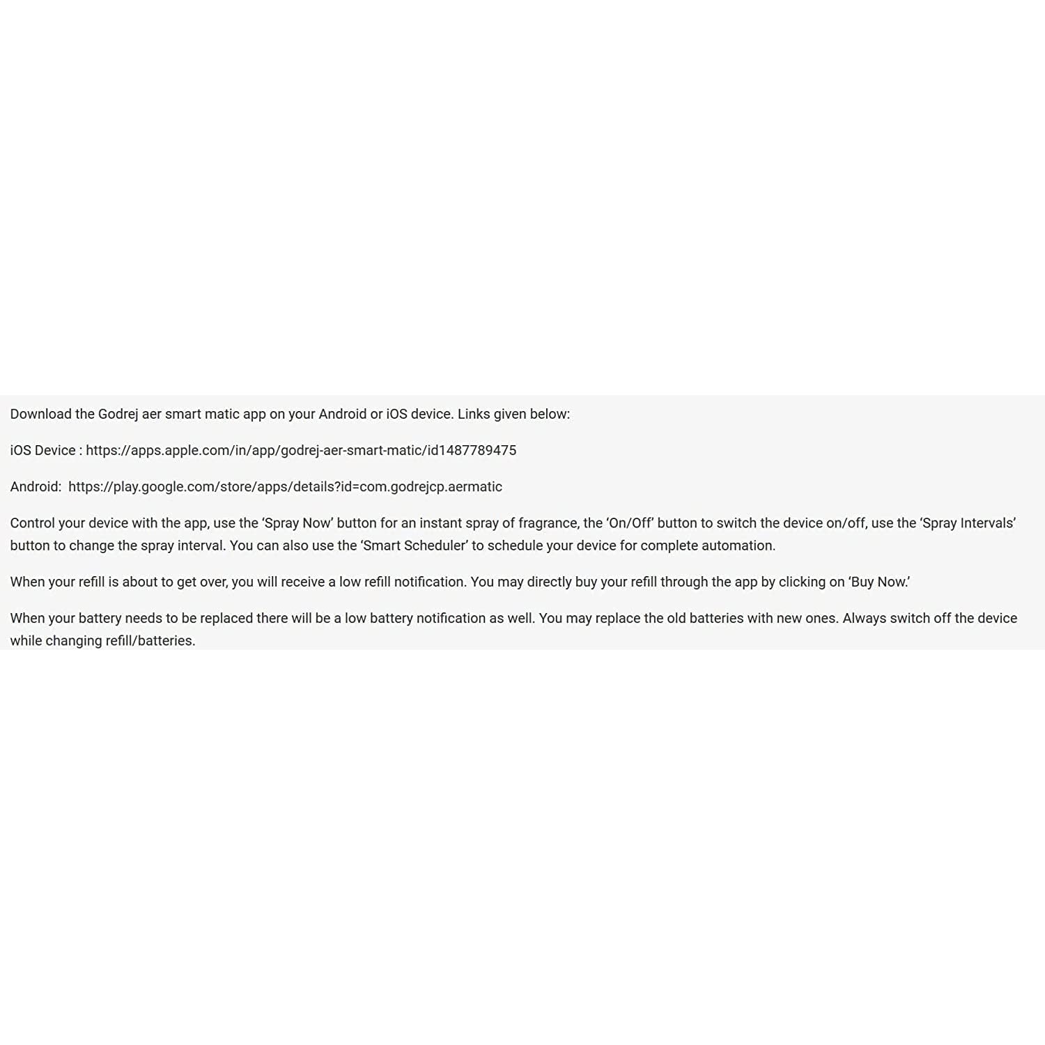 SMART FEATURES: App-controlled Switch on/off, Instant spray button, Low battery/Refill alerts