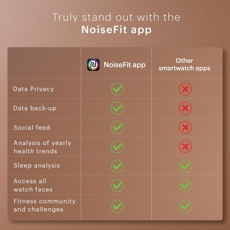BT Calling: Stay connected on the go making every call effortlessly convenient.;NoiseFit app: Connect with the NoiseFit app where your health data and privacy are always protected. Unlock your peak potential by participating in challenges, track your progress, and keep pushing your limits with a community of fitness enthusiasts.