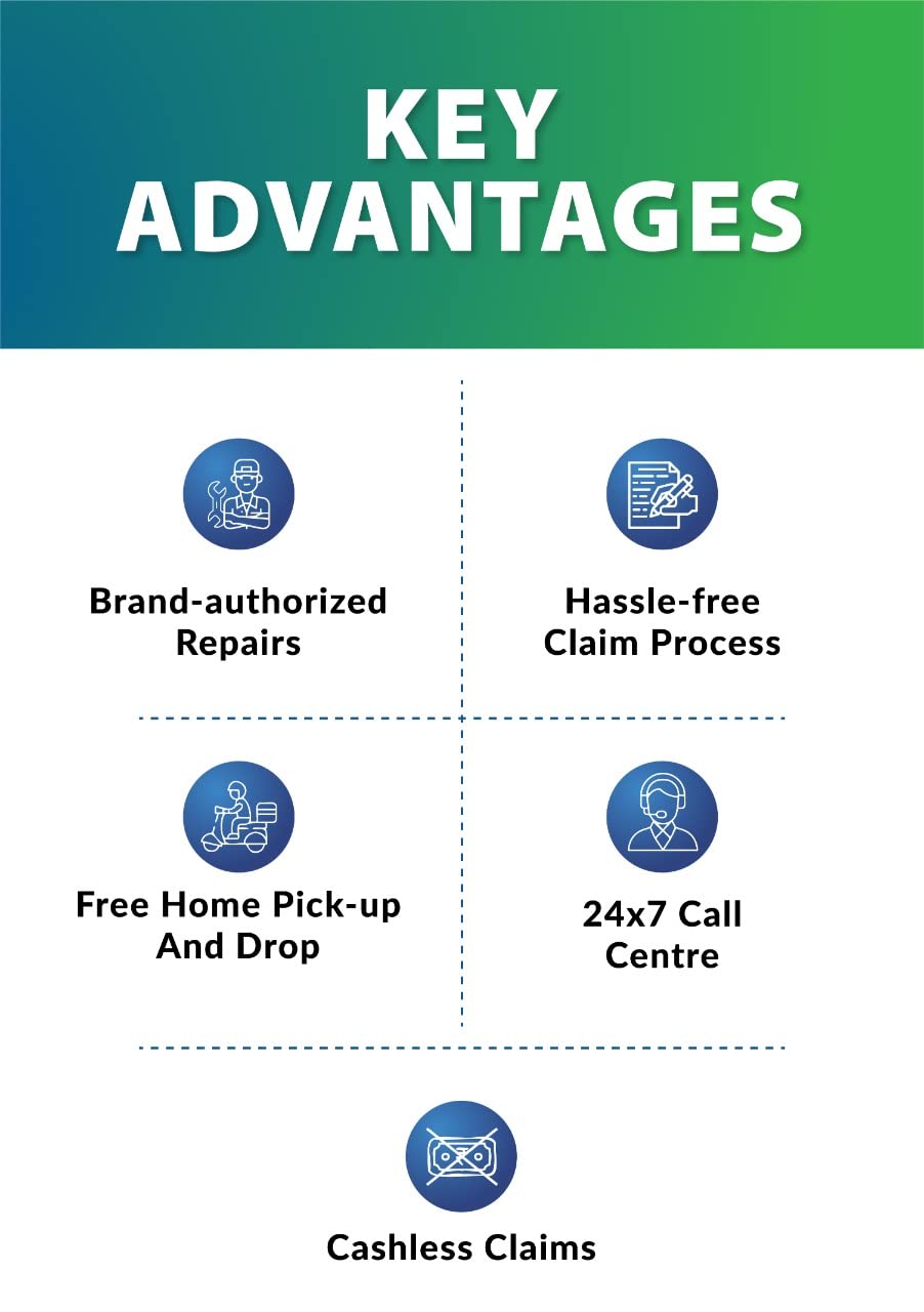 Remain stress free : ‘- Authorised Service Centre – Qualified Service Experts – Genuine Spare Parts only – Repair in 10 days or Refund – 100% cashless – No hidden fees – Unlimited claims till invoice value