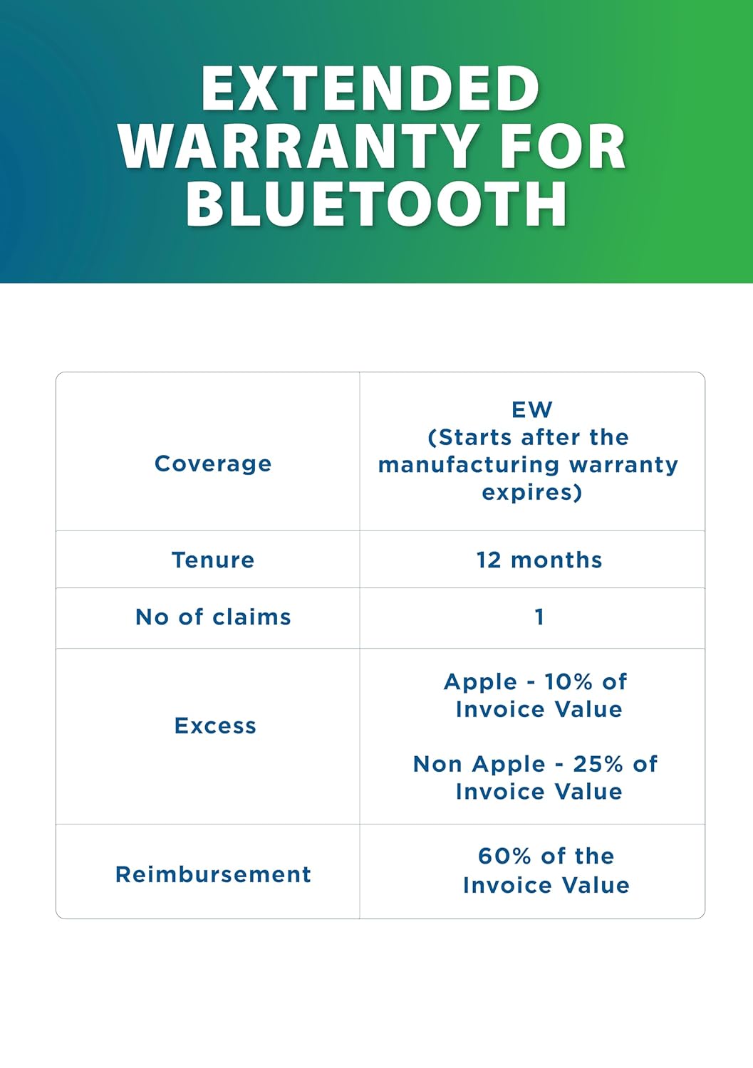 Validity : Extended Warranty will start after the Brand warranty ends & continues for 1 year/ 2 years as per plan. What’s covered : The plan covers all defects & electric malfunctions as covered under the original Brand warranty.