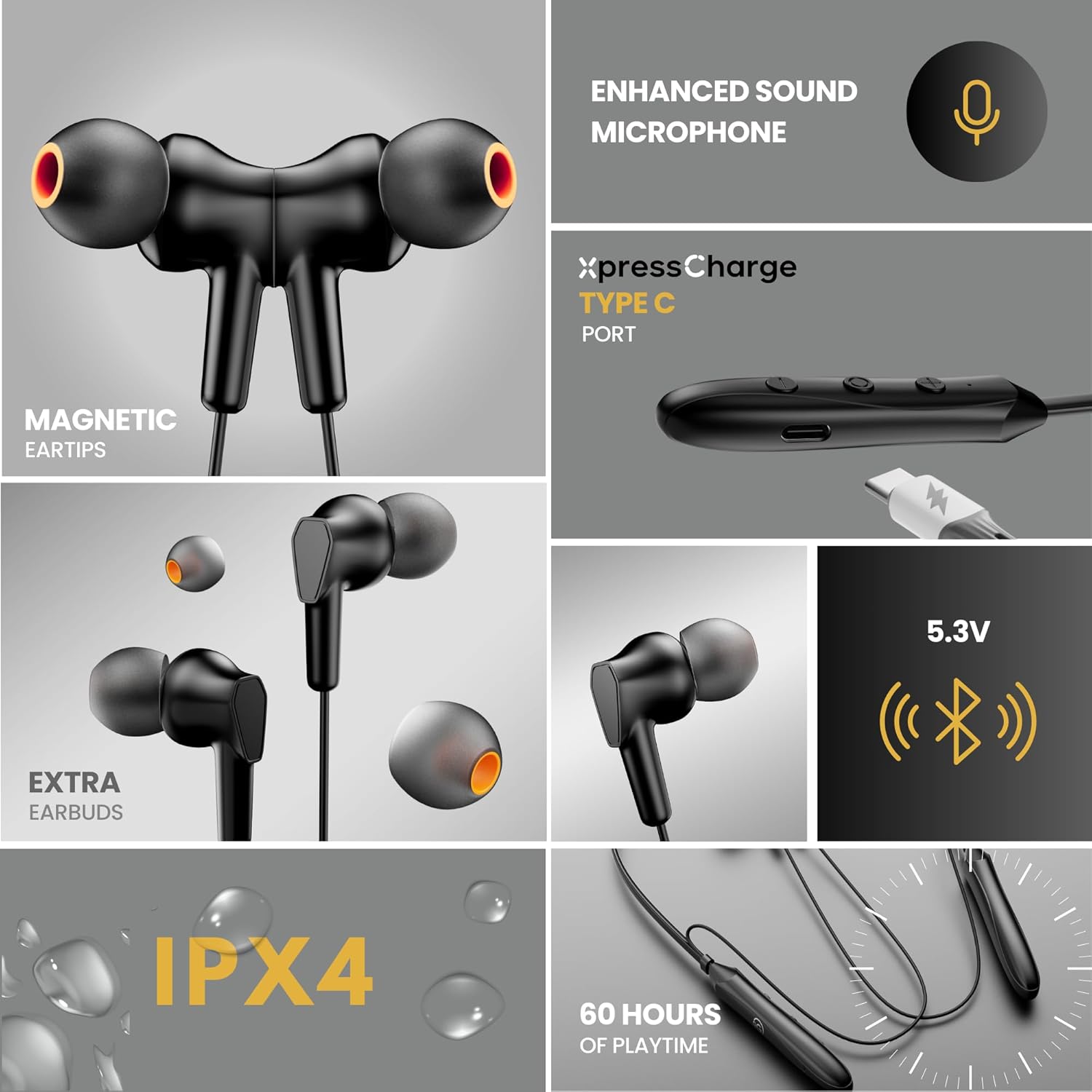 OOGE Tune 6 Neckband Bluetooth Headphones, 60H Playtime, Deep Bass, Type-C Charging, Magnetic Ear Tips, IPX4 Sweat Resistant, Sound Pulse Mic (Black)