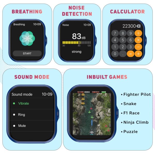 Built-in Mic & Loudspeaker, Bluetooth 5.0 with 10 mtrs Wireless Range, Use pTron Fit+ App, Smartwatch Compatible with Android 8.0 & above/iOS 9.1 & above, Just 3Hrs Magnetic Charging & 1-Year Warranty;Noise Detection, Breathing Exercise, Social Media Notifications, Quick Tools on Homepage, Voice Assistant, Raise & Awake Display, Music/Camera Control, Stopwatch & Alarm, Find Watch & 4 Menu Styles
