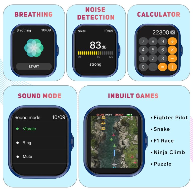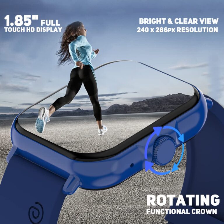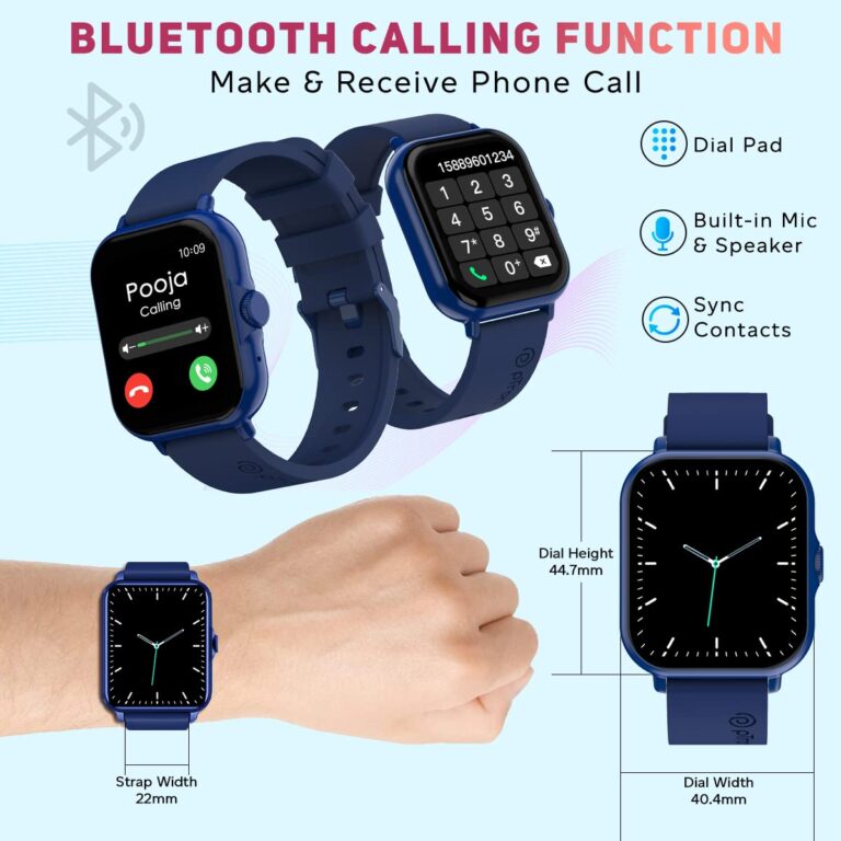 1.85″ Full Touch Bright TFT LCD Display | Rotating Crown to Control the Menu* | Bluetooth Calling – Make/Receive Calls, Sync Contacts & Dial Pad | upto 5 Days Battery Life* (depends on usage factors);5 Built-in Games, Smart Health/Fitness Trackers, Real-time Heart Rate Check, SpO2 Blood Oxygen, Blood Pressure Check, Sleep Monitor, Sedentary Alert, Step Count, Calories Burnt & 8 Sports Mode