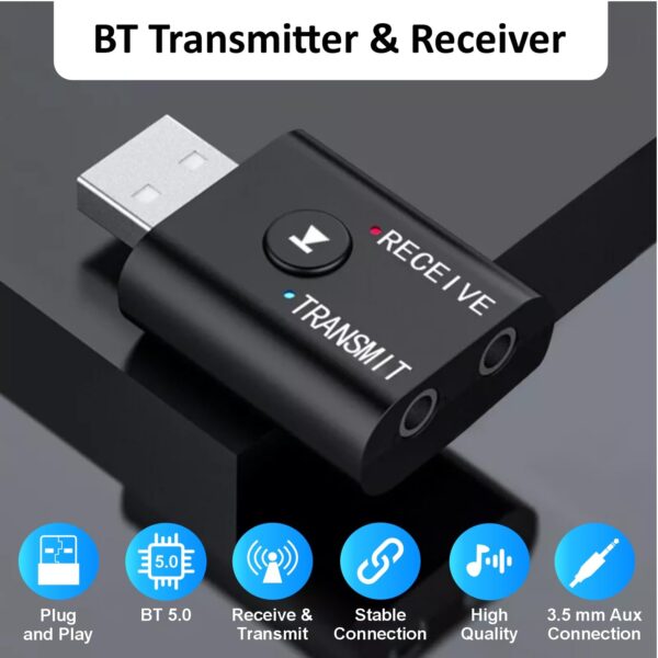 TECHONTO Bluetooth 5.0 2-in-1 Transmitter & Receiver Converter – Wireless Audio Adapter for Car & Home, USB Powered, 3.5mm Aux, Hands-Free Calls, Compatible with TV, PC, Speakers, Headphones