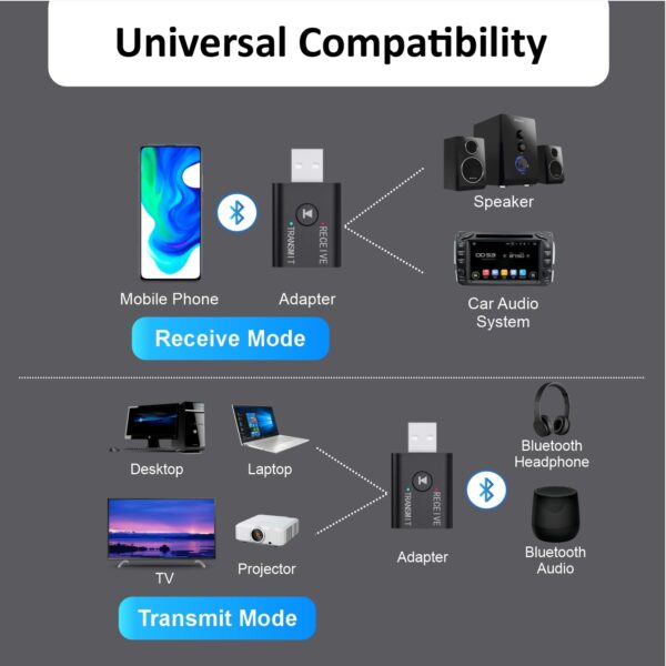 Dual Functionality (Transmitter & Receiver): Easily switch between Transmitter and Receiver modes to stream audio wirelessly from non-Bluetooth devices to Bluetooth speakers/headphones, or from Bluetooth devices to wired stereo systems—perfect for both cars and home use.