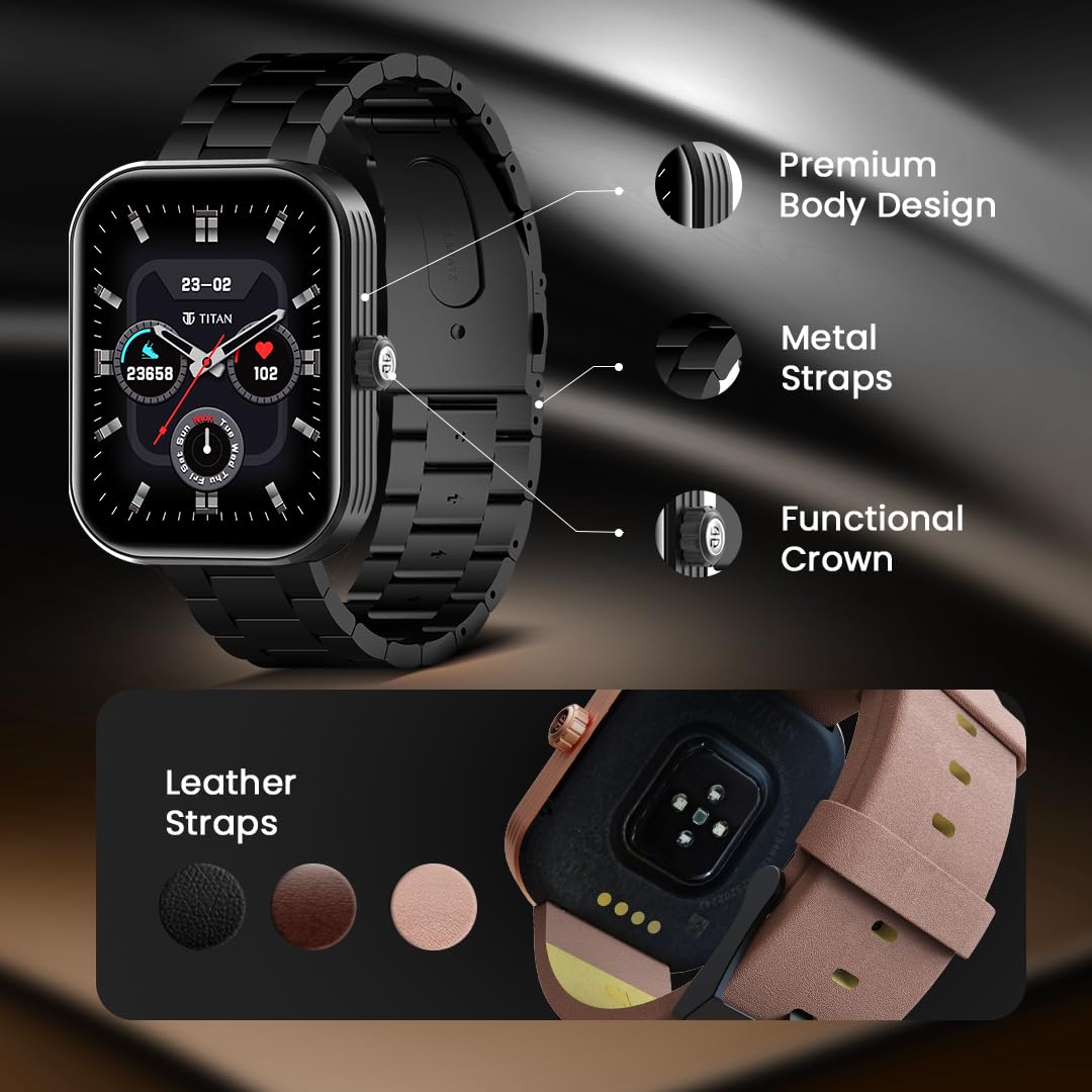 Titan Mirage with1.96” AMOLED Display with AOD and 410×502 Pixel Resolution , Metal and Leather Straps, Functional Crown , SingleSync BT Calling , Auto Recognition of Multi Sports, Passcode Protect , SOS Calling , Sports Records , 100+ Watchfaces , AI Voice Assistant, Auto Stress & Mood Monitor , 24×7 HRM , SpO2 , Sleep Monitor with Nap, Breathe Exercise, Multiple Menu Styles, Up to 5 Days Battery, IP68 Water Resistance, Additional Silicone Strap, In-Built Alarm , Screen-On Time , Calculator, Split Screen, Add Favourite Screen Shortcuts , Sound and Vibration Settings