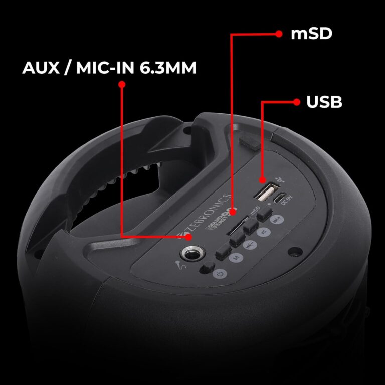 Be the first to review “ZEBRONICS Sound Feast 90 10W Output, Portable Wireless Speaker with Bluetooth v5.0, TWS, 6.3mm Wired Mic Support, USB, mSD, AUX, Mobile Holder and RGB Lights” Cancel reply